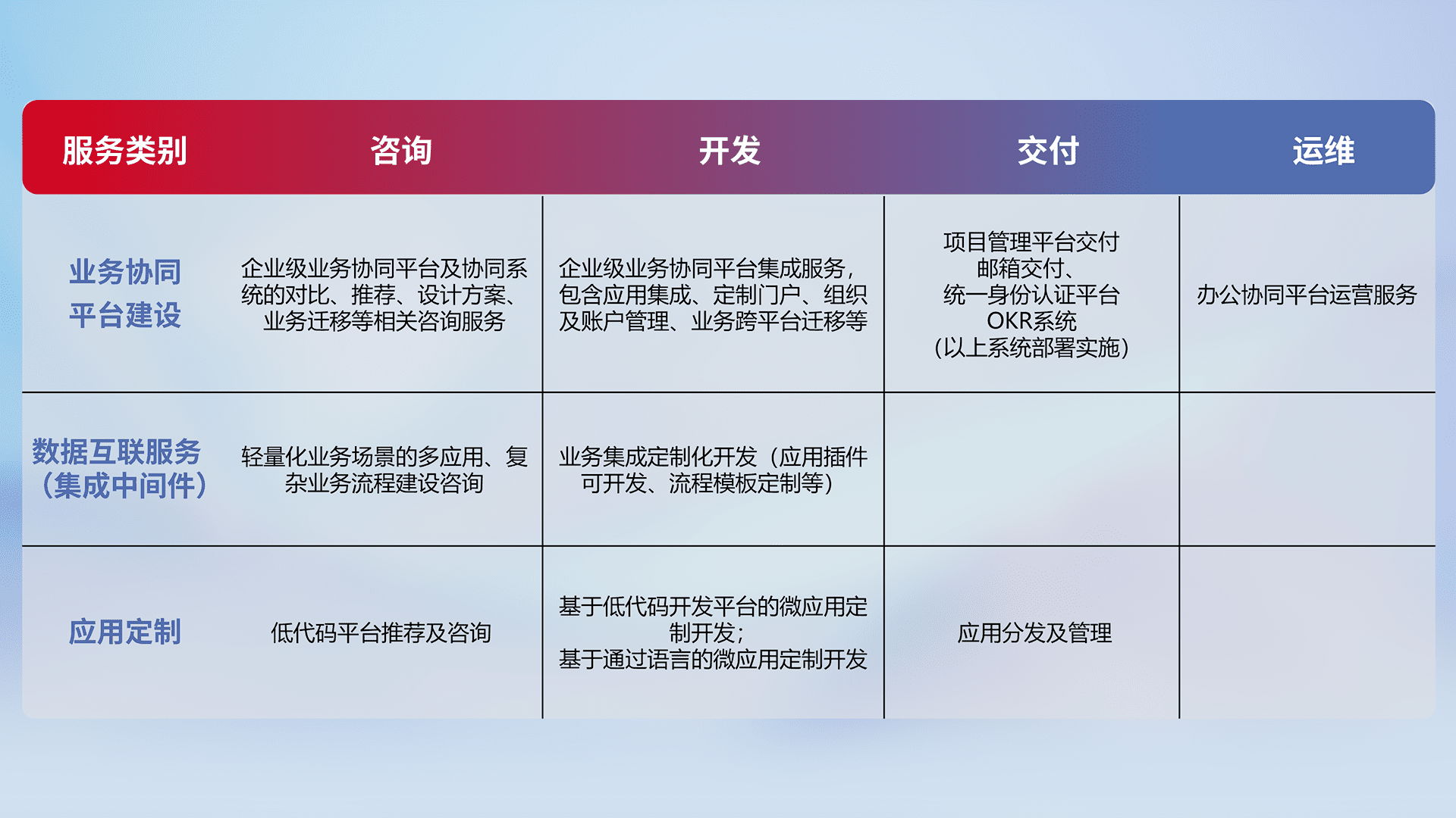 针对钉钉、、、企微、、、、IDaas等平台级产品提供产品的规划、、、方案、、、、交付、、、定制化开发等服务,,,,实现如统一协同办公、、智能客户服务、、、、混合会议管理、、智能数据查询、、、等业务场景,,实现数字化转型。。。